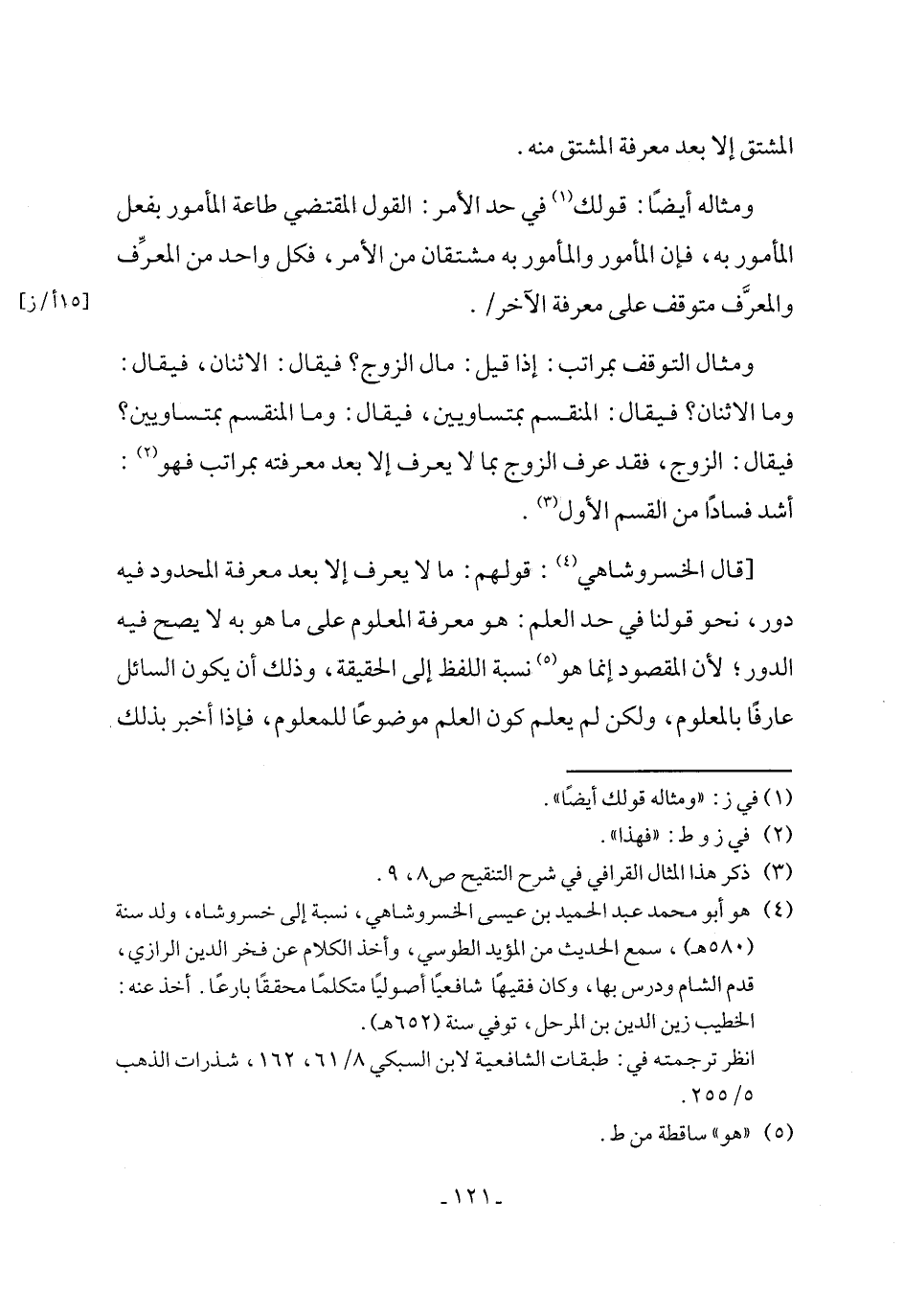 (٤) هو أبو محمد عبد الحميد بن عيسى الخسروشاهي، نسبة إلى خسروشاه، ولد سنة (٥٨٠ هـ)، سمع الحديث من المؤيد الطوسي، وأخذ الكلام عن فخر الدين الرازي، قدم الشام ودرس بها، وكان فقيهًا شافعيًا أصوليًا متكلمًا محققًا بارعًا. أخذ عنه: الخطيب زين الدين بن المرحل، توفي سنة (٦٥٢ هـ).