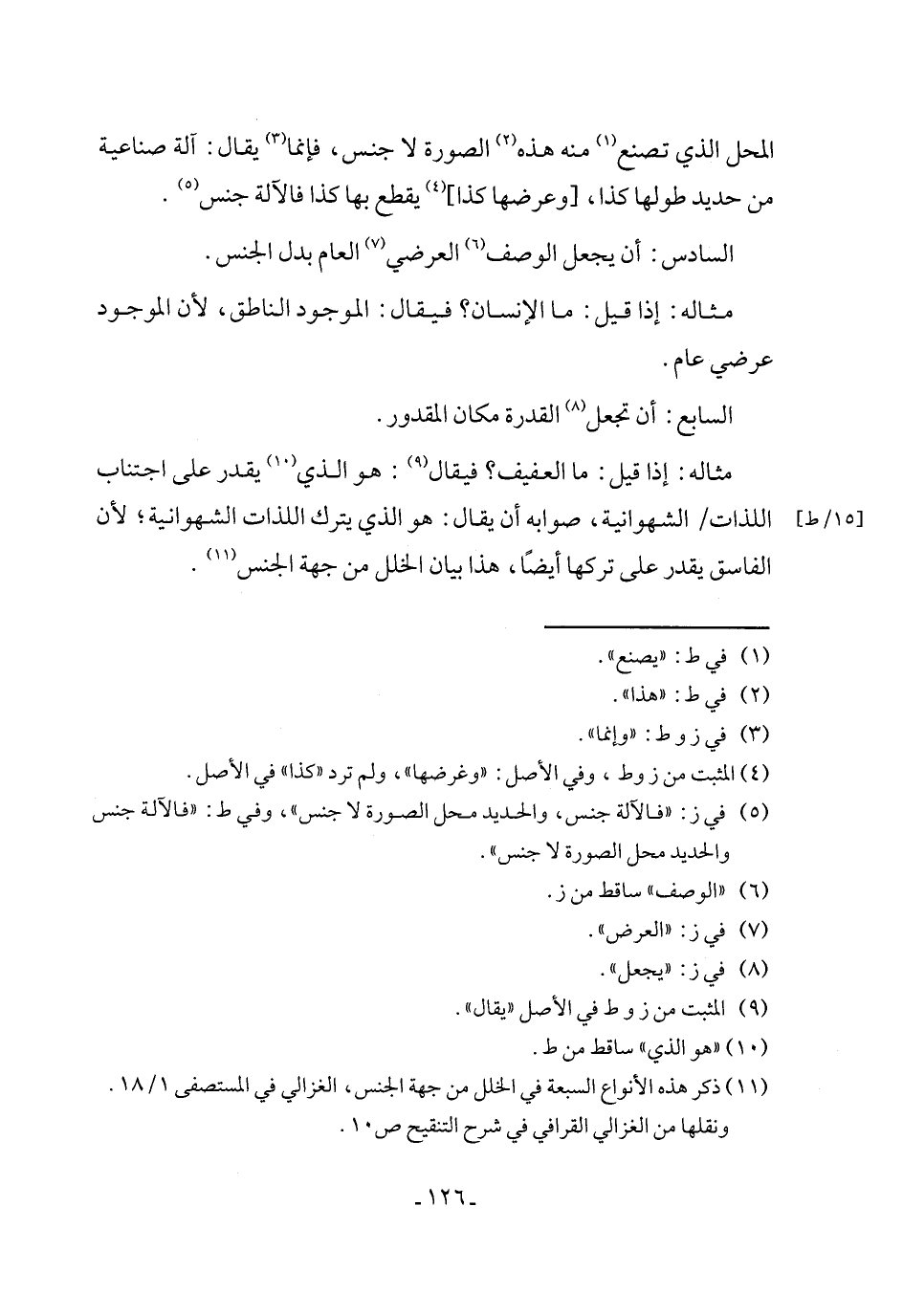 (١١) ذكر هذه الأنواع السبعة في الخلل من جهة الجنس، الغزالي في المستصفى ١/ ١٨. ونقلها من الغزالي القرافي في شرح التنقيح ص ١٠.