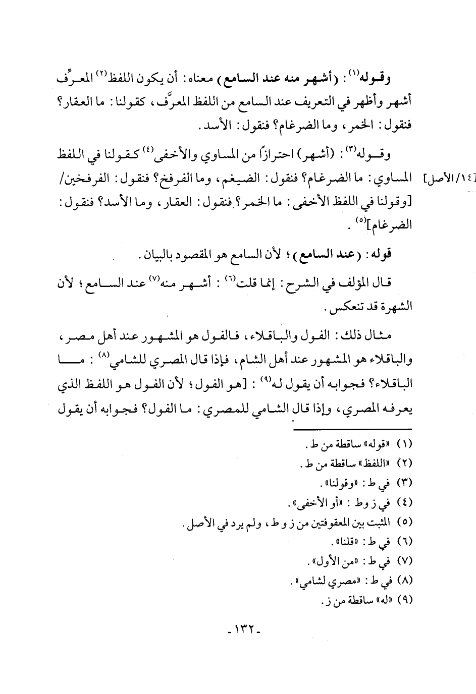 مثال ذلك: الفول والباقلاء، فالفول هو المشهور عند أهل مصر، والباقلاء هو المشهور عند أهل الشام، فإذا قال المصري للشامي (٨): ما الباقلاء؟ فجوابه أن يقول له (٩): [هو الفول؛ لأن الفول هو اللفظ الذي يعرفه المصري، وإذا قال الشامي للمصري: ما الفول؟ فجوابه أن يقول