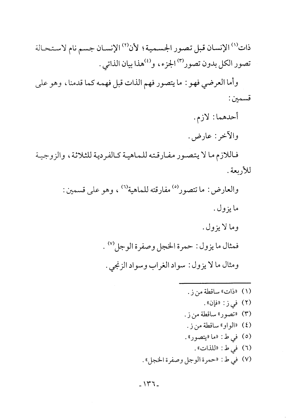 والعارض: ما تتصور (٥) مفارقته للماهية (٦)، وهو على قسمين: