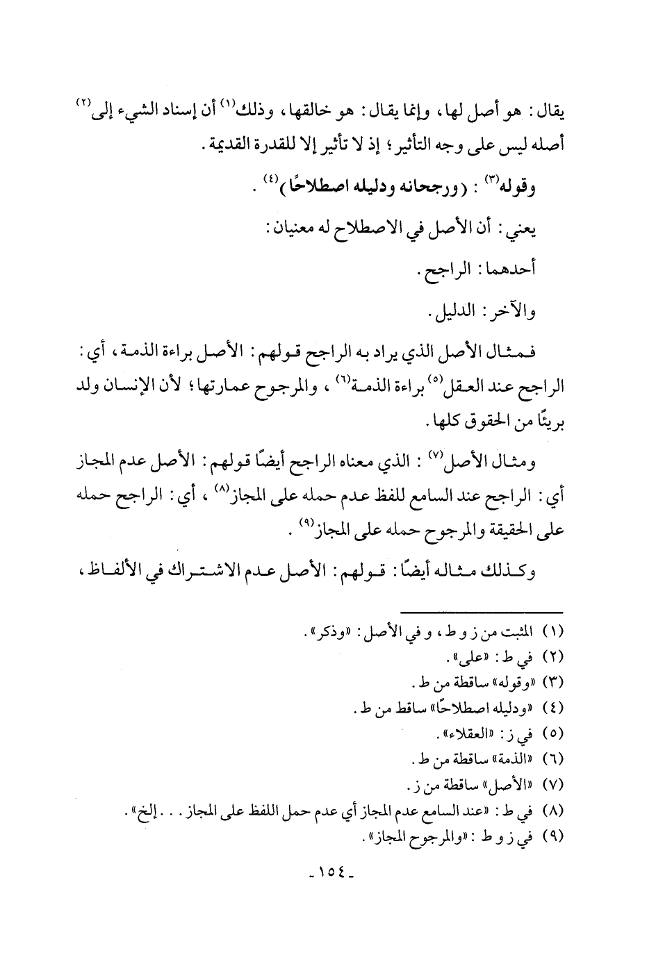 ومثال الأصل (٧): الذي معناه الراجح أيضًا قولهم: الأصل عدم المجاز أي: الراجح عند السامع للفظ عدم حمله على المجاز (٨)، أي: الراجح حمله على الحقيقة والمرجوح حمله على المجاز (٩).