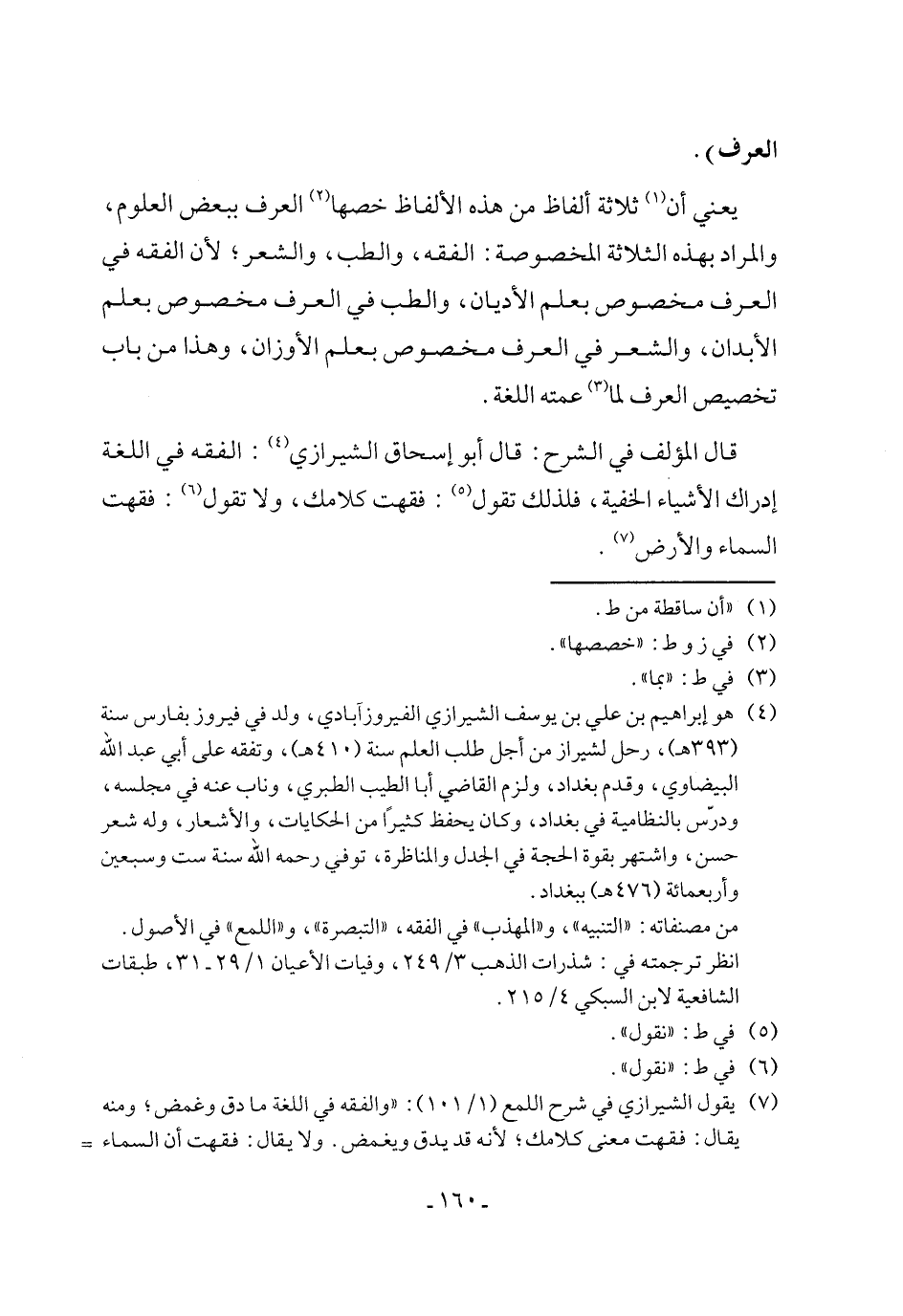 (٧) يقول الشيرازي في شرح اللمع (١/ ١٠١): "والفقه في اللغة ما دق وغمض؛ ومنه يقال: فقهت معنى كلامك؛ لأنه قد يدق ويغمض. ولا يقال: فقهت أن السماء =