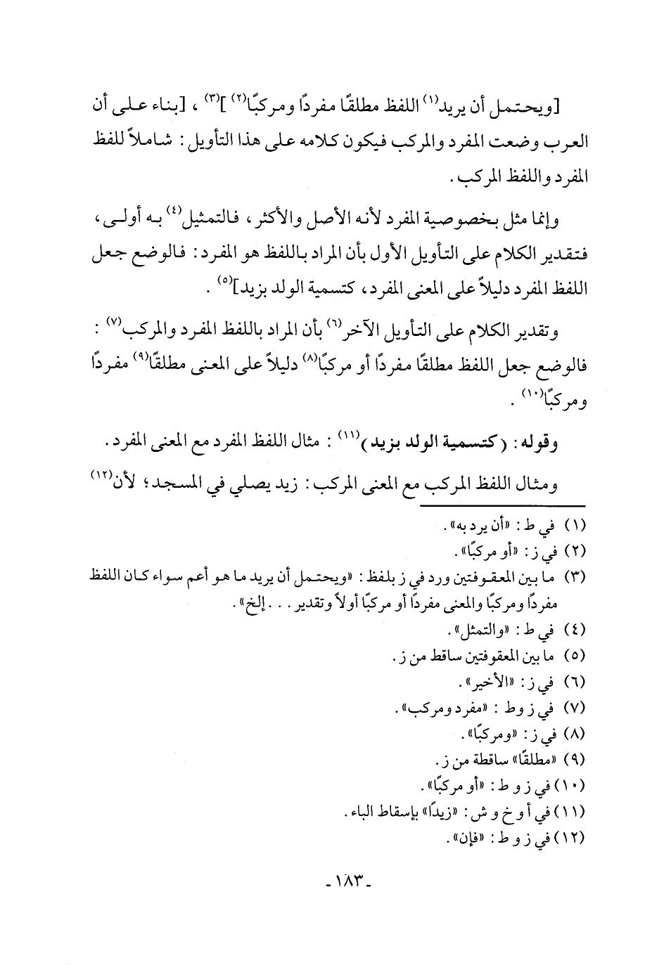 (٣) ما بين المعقوفتين ورد في ز بلفظ: "ويحتمل أن يريد ما هو أعم سواء كان اللفظ مفردًا ومركبًا والمعنى مفردًا أو مركبًا أولاً وتقدير ... إلخ".