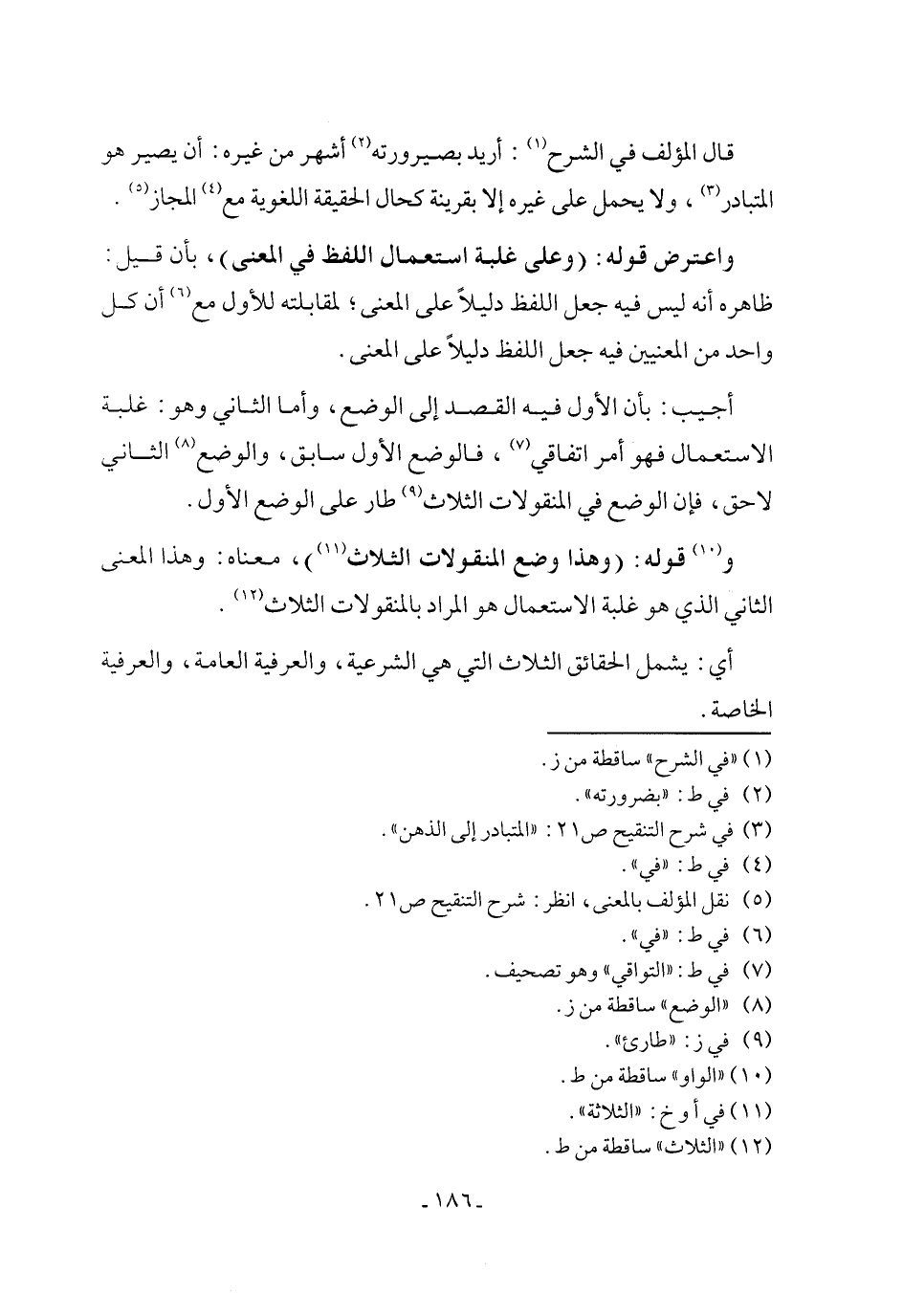 و (١٠) قوله: (وهذا وضع المنقولات الثلاث (١١))، معناه: وهذا المعنى الثاني الذي هو غلبة الاستعمال هو المراد بالمنقولات الثلاث (١٢).