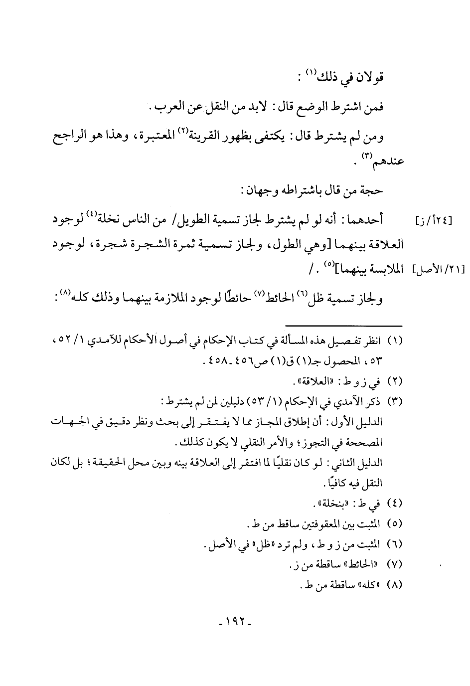 أحدهما: أنه لو لم يشترط لجاز تسمية الطويل من الناس نخلة (٤) لوجود العلاقة بينهما [وهي الطول، ولجاز تسمية ثمرة الشجرة شجرة، لوجود الملابسة بينهما] (٥).