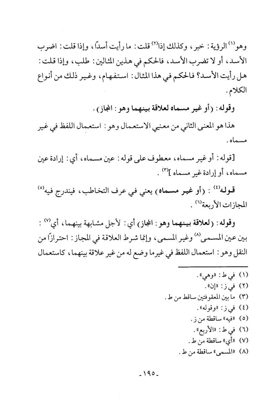 وقوله: (لعلاقة بينهما وهو: المجاز) أي: لأجل مشابهة بينهما، أي (٧): بين عين المسمى (٨) وغير المسمى، وإنما شرط العلاقة في المجاز: احترازًا من النقل وهو: استعمال اللفظ في غير ما وضع له من غير علاقة بينهما، كاستعمال