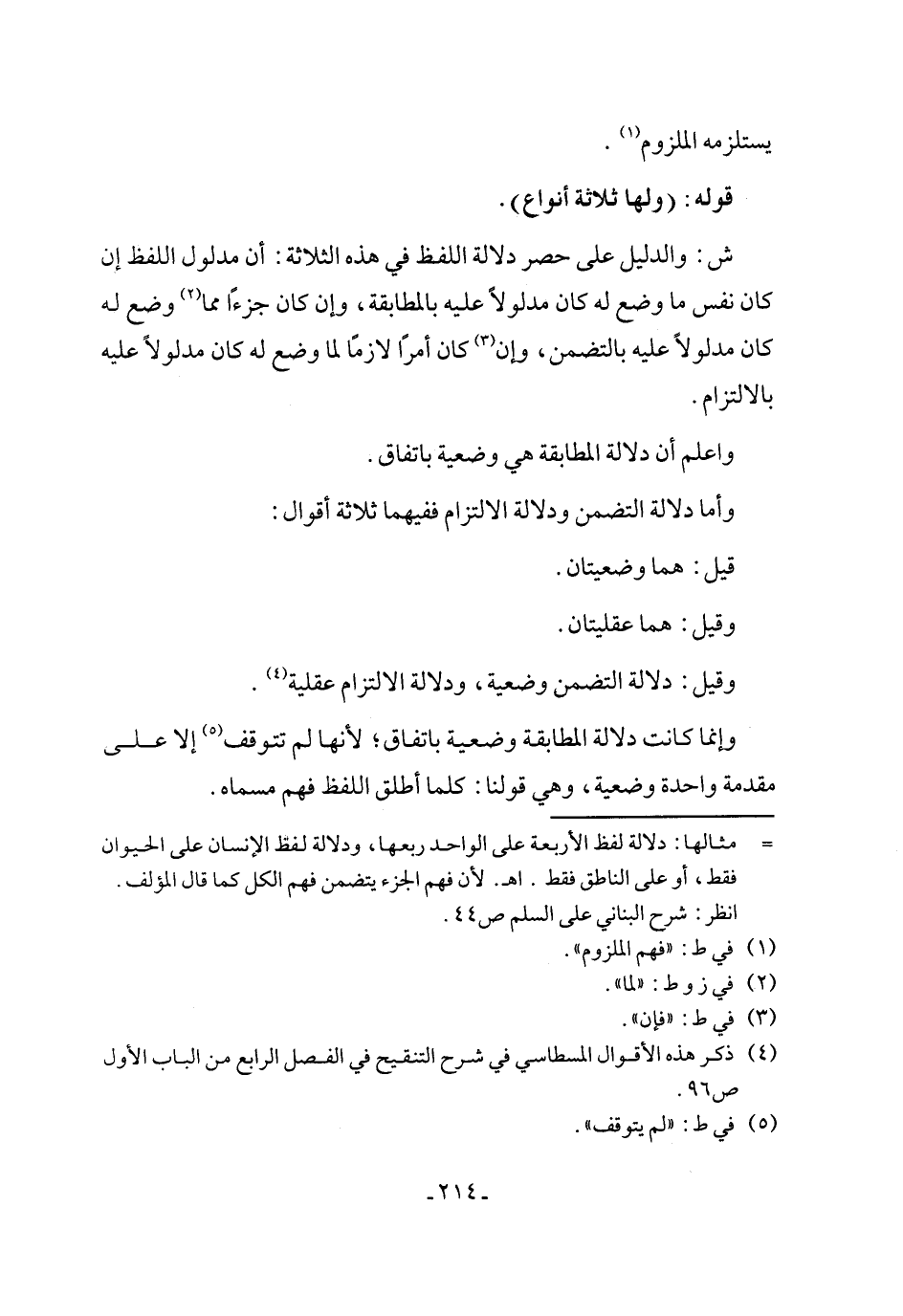 ش: والدليل على حصر دلالة اللفظ في هذه الثلاثة: أن مدلول اللفظ إن كان نفس ما وضع له كان مدلولاً عليه بالمطابقة، وإن كان جزءًا مما (٢) وضع له كان مدلولاً عليه بالتضمن، وإن (٣) كان أمرًا لازمًا لما وضع له كان مدلولاً عليه بالالتزام.