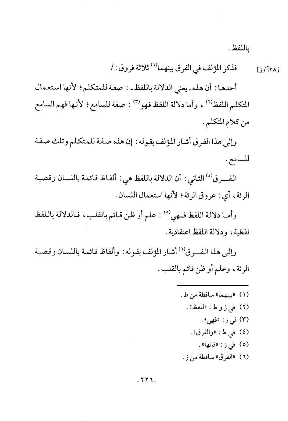 وإلى هذا الفرق (٦) أشار المؤلف بقوله: وألفاظ قائمة باللسان وقصبة الرئة، وعلم أو ظن قائم بالقلب.