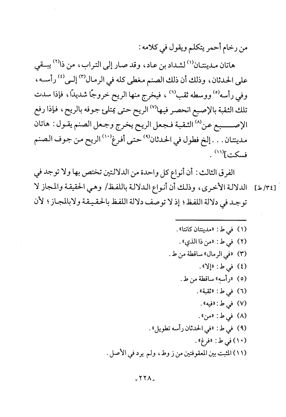 هاتان مدينتان (١) لشداد بن عاد، وقد صار إلى التراب، من ذا (٢) يبقي على الحدثان، وذلك أن ذلك الصنم مغطى كله في الرمال (٣) إلى (٤) رأسه، وفي رأسه (٥) ووسطه ثقب (٦)، فيخرج منها الريح خروجًا شديدًا، فإذا سدت تلك الثقبة بالإصبع انحصر فيها (٧) الريح حتى يمتلئ جوفه بالريح، فإذا رفع الإصبع عن (٨) الثقبة فجعل الريح يخرج وجعل الصنم يقول: هاتان مدينتان ... إلخ فطول في الحدثان (٩) حتى أفرغ (١٠) الريح من جوف الصنم فسكت] (١١).