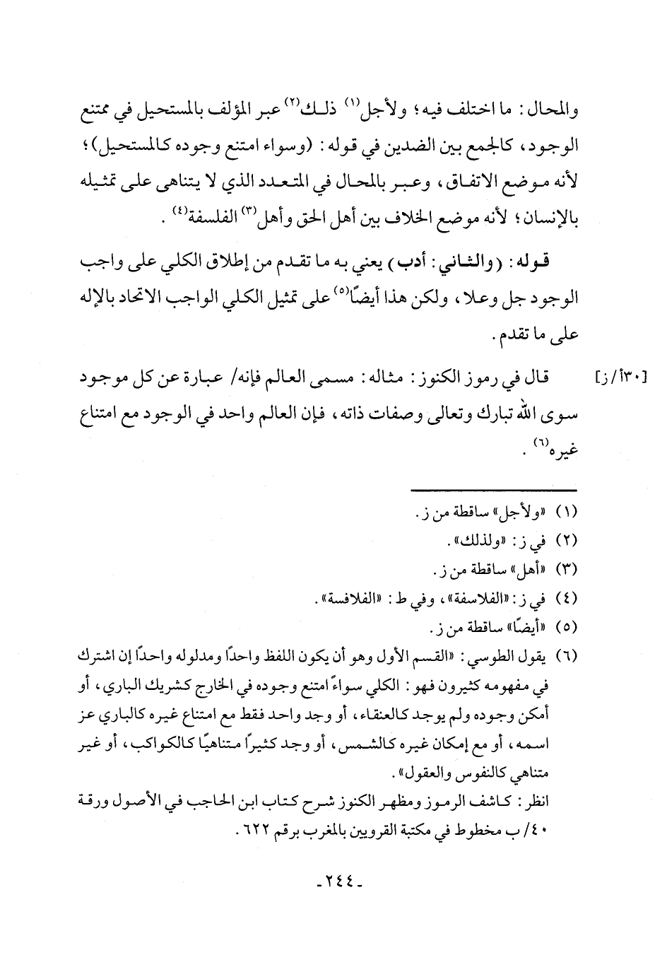 (٦) يقول الطوسي: "القسم الأول وهو أن يكون اللفظ واحدًا ومدلوله واحدًا إن اشترك في مفهومه كثيرون فهو: الكلي سواءً امتنع وجوده في الخارج كشريك الباري، أو أمكن وجوده ولم يوجد كالعنقاء، أو وجد واحد فقط مع امتناع غيره كالباري عز اسمه، أو مع إمكان غيره كالشمس، أو وجد كثيرًا متناهيًا كالكواكب، أو غير متناهي كالنفوس والعقول".