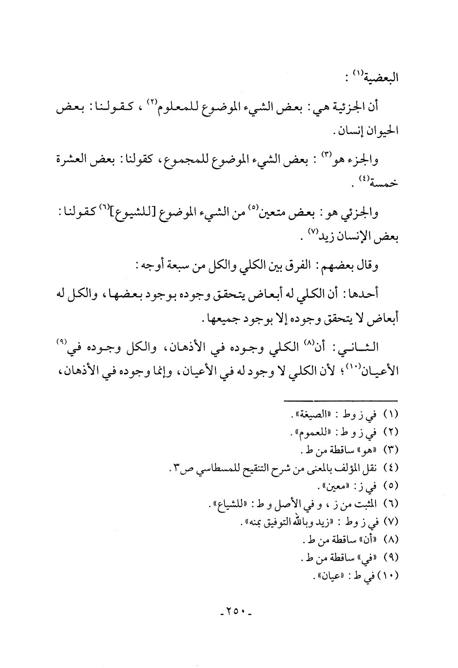 والجزء هو (٣): بعض الشيء الموضوع للمجموع، كقولنا: بعض العشرة خمسة (٤).