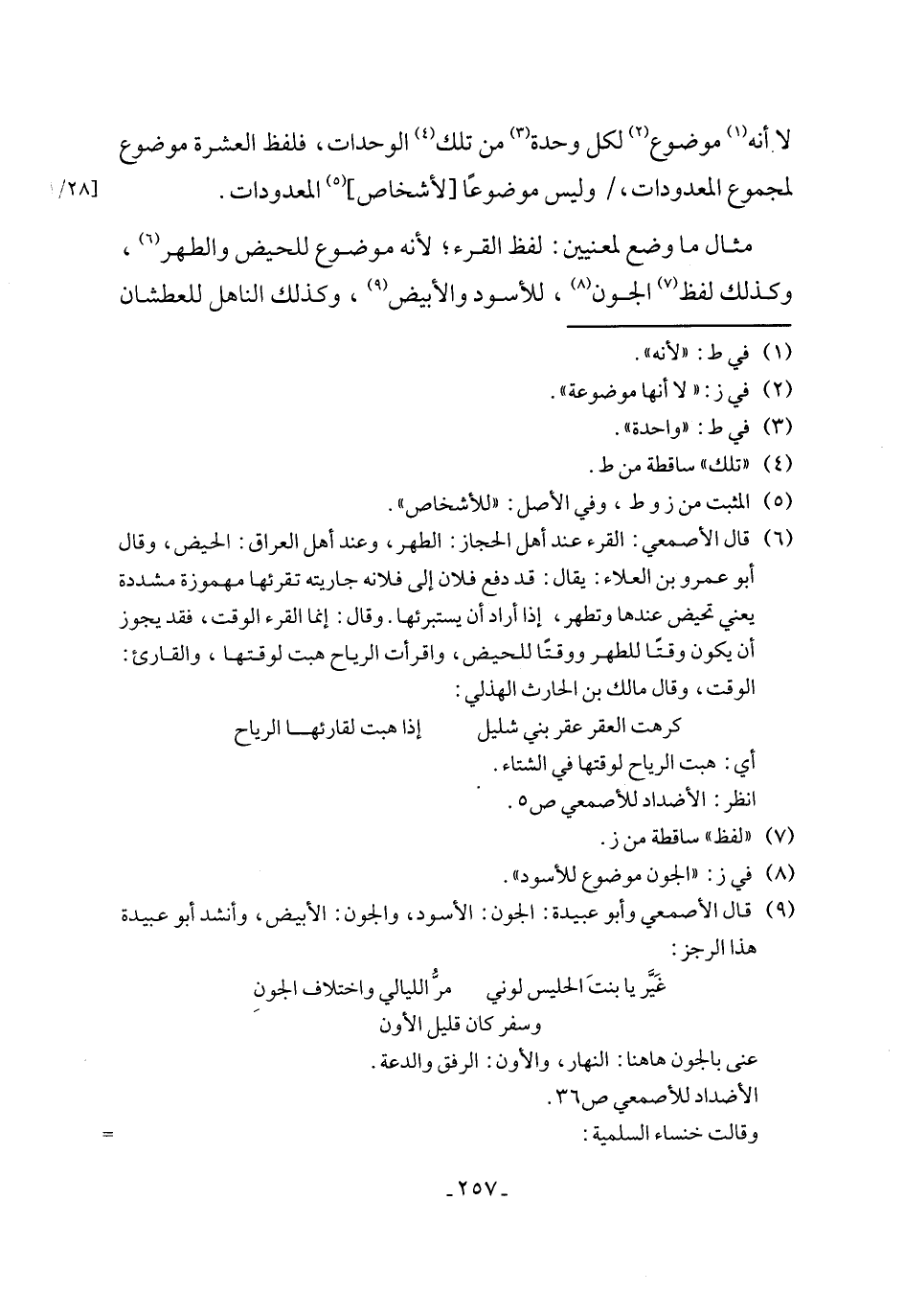 مثال ما وضع لمعنيين: لفظ القرء؛ لأنه موضوع للحيض والطهر (٦)، وكذلك لفظ (٧) الجون (٨)، للأسود والأبيض (٩)، وكذلك الناهل للعطشان