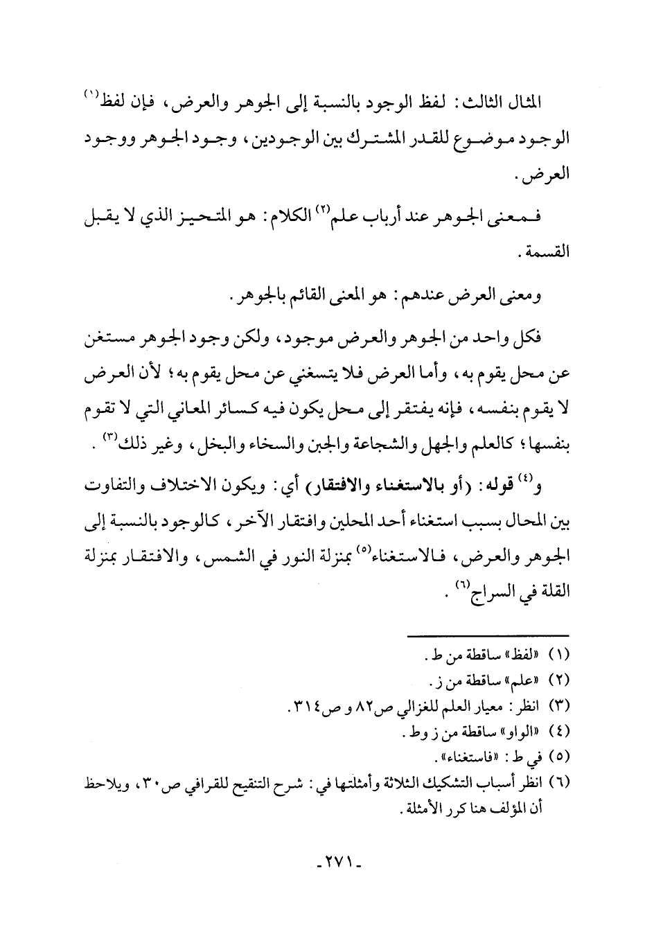 و (٤) قوله: (أو بالاستغناء والافتقار) أي: ويكون الاختلاف والتفاوت بين المحال بسبب استغناء أحد المحلين وافتقار الآخر، كالوجود بالنسبة إلى الجوهر والعرض، فالاستغناء (٥) بمنزلة النور في الشمس، والافتقار بمنزلة القلة في السراج (٦).