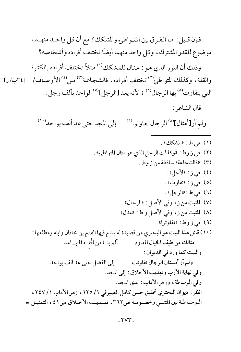وذلك أن النور الذي هو: مثال للمشكك (١) مثلاً تختلف أفراده بالكثرة والقلة، وكذلك المتواطئ (٢) تختلف أفراده، فالشجاعة (٣) من (٤) الأوصاف التي يتفاوت (٥) بها الرجال (٦)؛ لأنه يعد [الرجل] (٧) الواحد بألف رجل.