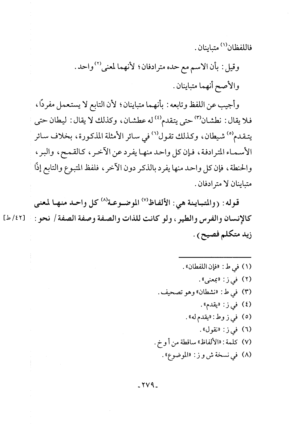 وأجيب عن اللفظ وتابعه: بأنهما متباينان؛ لأن التابع لا يستعمل مفردًا، فلا يقال: نطشان (٣) حتى يتقدم (٤) له عطشان، وكذلك لا يقال: ليطان حتى يتقدم (٥) شيطان، وكذلك تقول (٦) في سائر الأمثلة المذكورة، بخلاف سائر الأسماء المترادفة، فإن كل واحد منها يفرد عن الآخر، كالقمح، والبر، والحنطة، فإن كل واحد منها يفرد بالذكر دون الآخر، فلفظ المتبوع والتابع إذًا متباينان لا مترادفان.