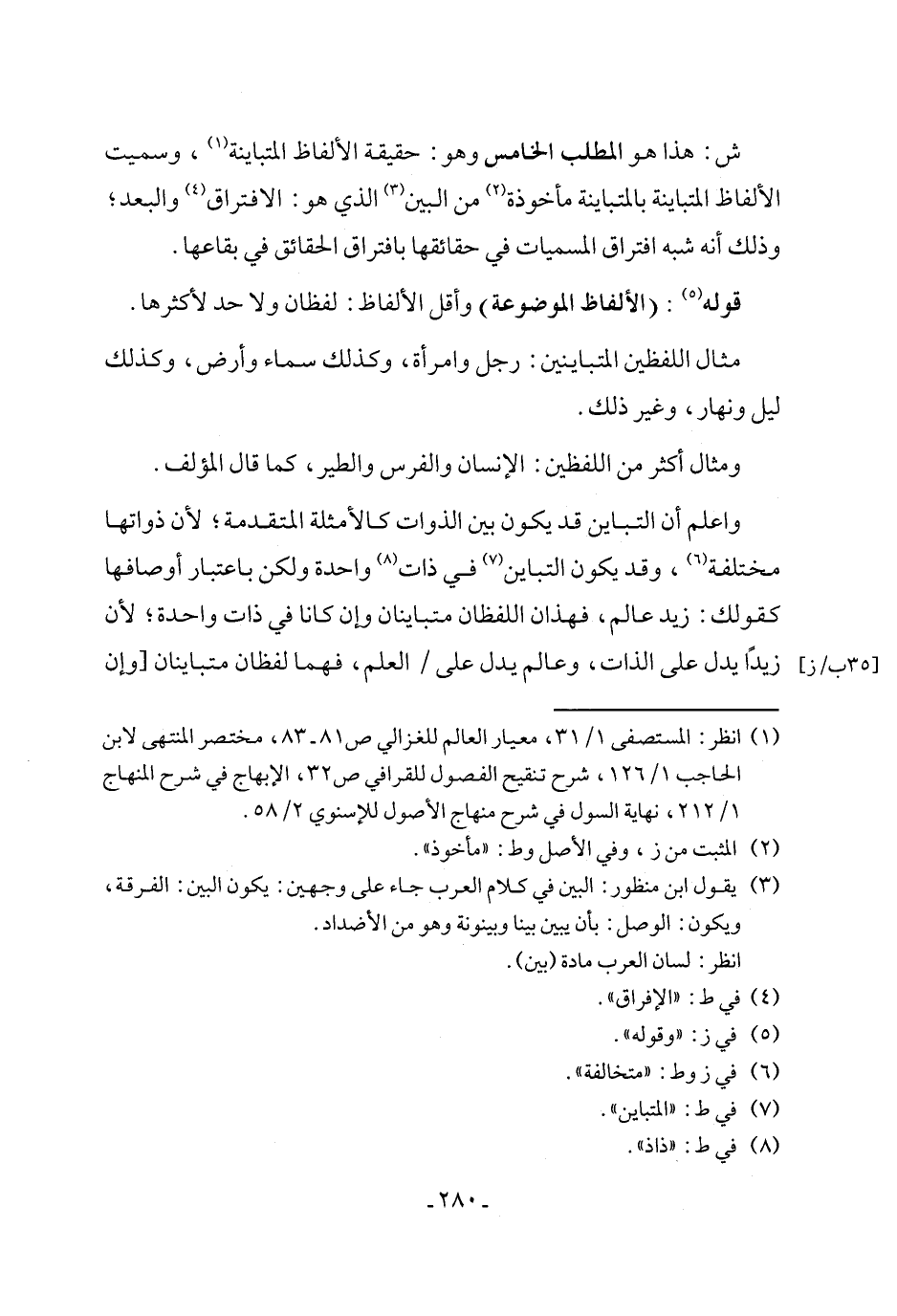 ش: هذا هو المطلب الخامس وهو: حقيقة الألفاظ المتباينة (١)، وسميت الألفاظ المتباينة بالمتباينة مأخوذة (٢) من البين (٣) الذي هو: الافتراق (٤) والبعد؛ وذلك أنه شبه افتراق المسميات في حقائقها بافتراق الحقائق في بقاعها.