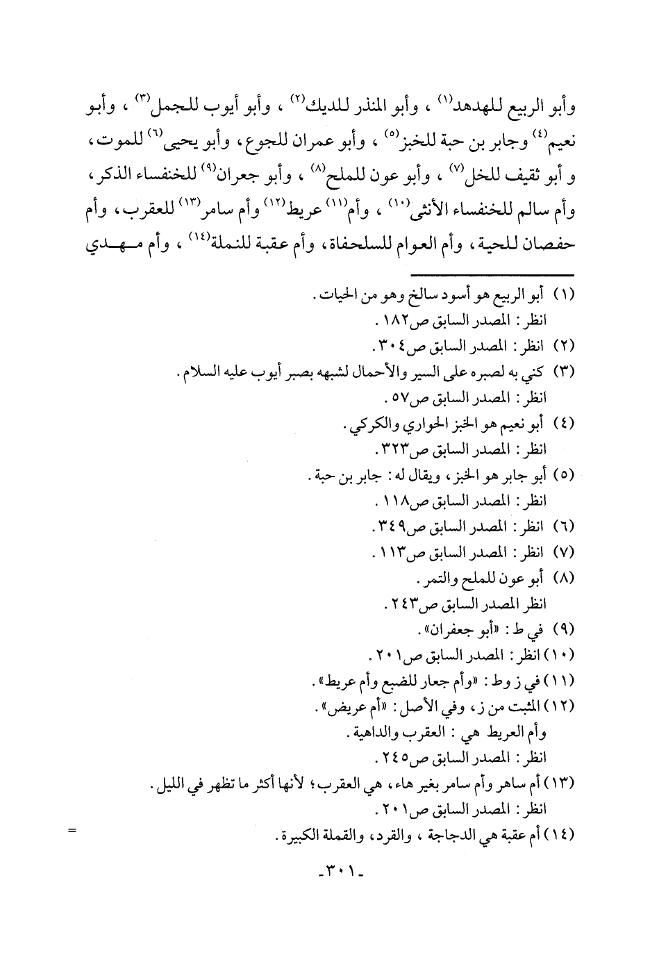 وأبو الربيع للهدهد (١)، وأبو المنذر للديك (٢)، وأبو أيوب للجمل (٣)، وأبو نعيم (٤) وجابر بن حبة للخبز (٥)، وأبو عمران للجوع، وأبو يحيى (٦) للموت، وأبو ثقيف للخل (٧)، وأبو عون للملح (٨)، وأبو جعران (٩) للخنفساء الذكر، وأم سالم للخنفساء الأنثى (١٠)، وأم (١١) عريط (١٢) وأم سامر (١٣) للعقرب، وأم حفصان للحية، وأم العوام للسلحفاة، وأم عقبة للنملة (١٤)، وأم مهدي