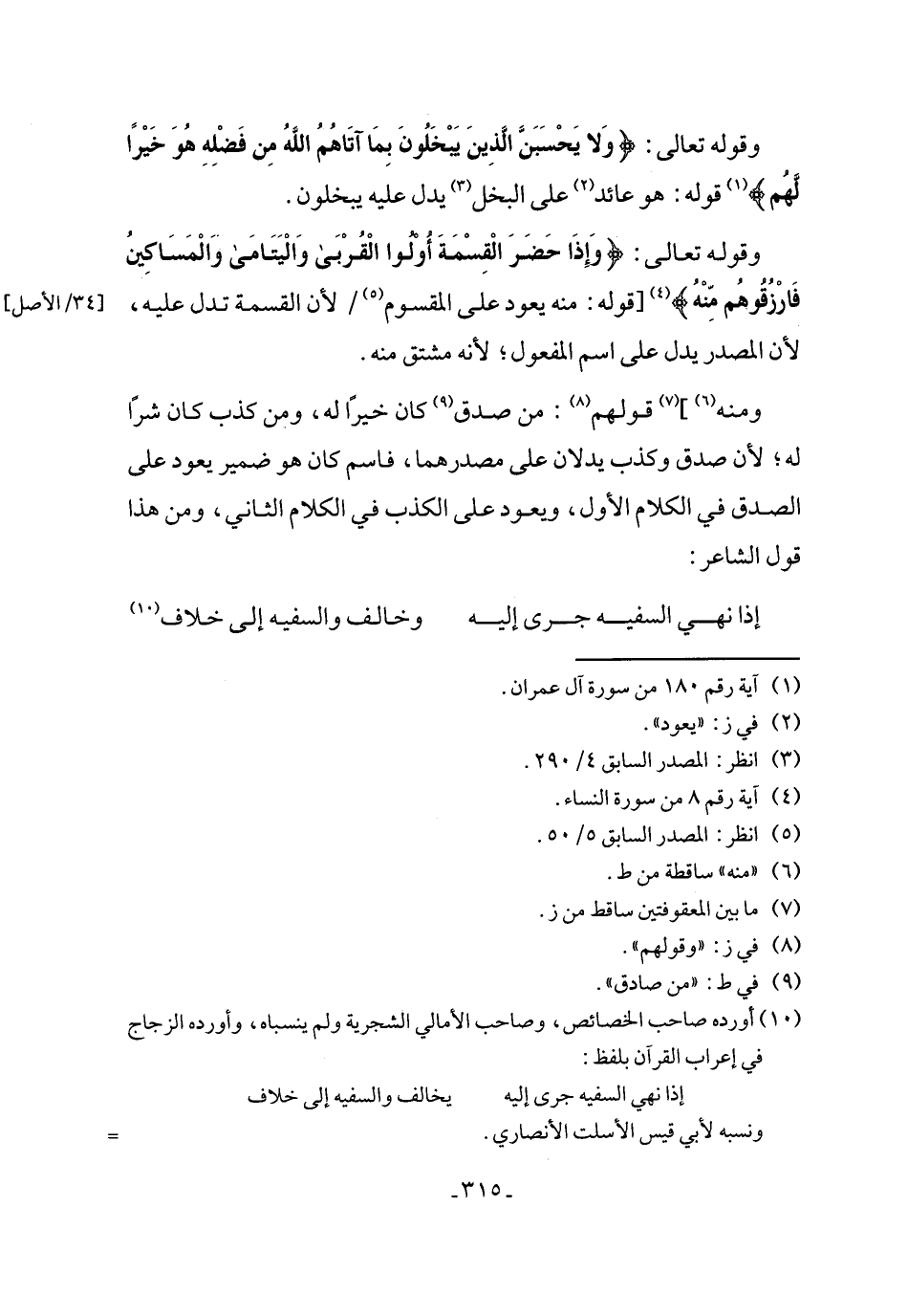 وقوله تعالى: {وَإِذَا حَضَرَ الْقِسْمَةَ أُولُو الْقُرْبَى وَالْيَتَامَى وَالْمَسَاكِينُ فَارْزُقُوهُمْ مِنْهُ} (٤) [قوله: منه يعود على المقسوم (٥) لأن القسمة تدل عليه، لأن المصدر يدل على اسم المفعول؛ لأنه مشتق منه.