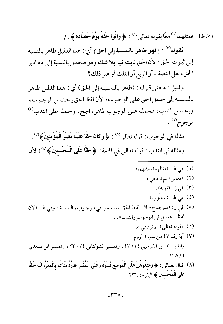 (٥) في ز: "مرجوح؛ لأن لفظ الحق استعمل في الوجوب والندب"، وفي ط: "لأن لفظ يستعمل في الوجوب والندب" ..