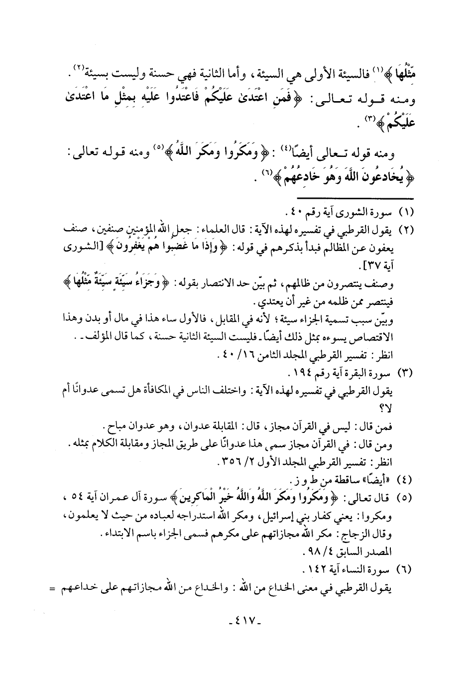 فمن قال: ليس في القرآن مجاز، قال: المقابلة عدوان، وهو عدوان مباح.