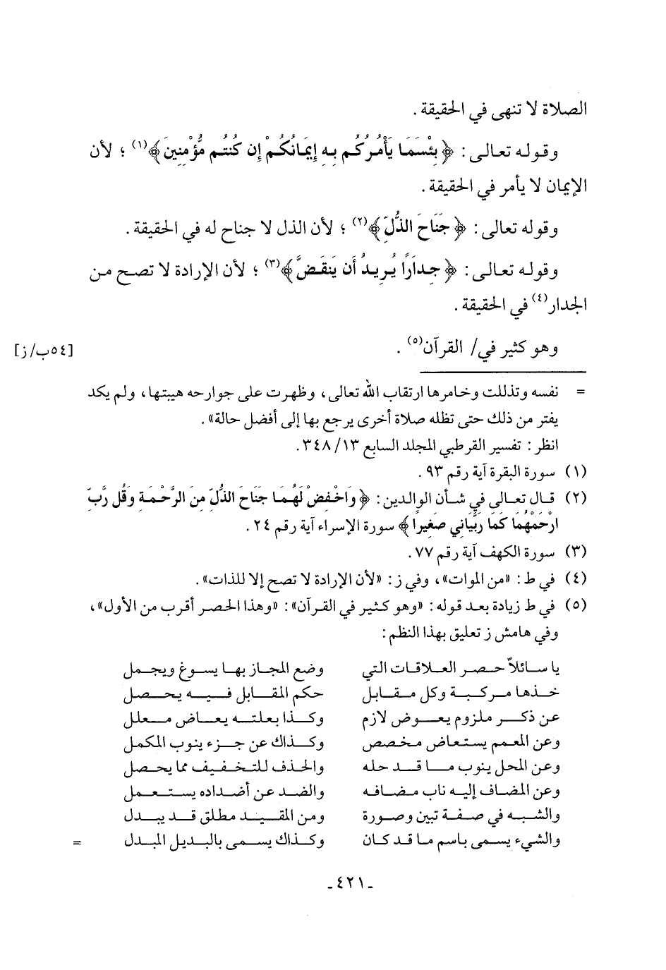 (٥) في ط زيادة بعد قوله: "وهو كثير في القرآن": "وهذا الحصر أقرب من الأول"، وفي هامش ز تعليق بهذا النظم:
