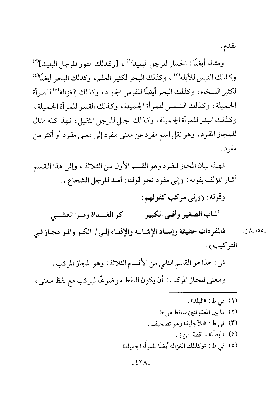 ومثاله أيضًا: الحمار للرجل البليد (١)، [وكذلك الثور للرجل البليد] (٢) وكذلك التيس للأبله (٣)، وكذلك البحر لكثير العلم، وكذلك البحر أيضًا (٤) لكثير السخاء، وكذلك البحر أيضًا للفرس الجواد، وكذلك الغزالة (٥) للمرأة الجميلة، وكذلك الشمس للمرأة الجميلة، وكذلك القمر للمرأة الجميلة، وكذلك البدر للمرأة الجميلة، وكذلك الجبل للرجل الثقيل، فهذا كله مثال للمجاز المفرد، وهو نقل اسم مفرد عن معنى مفرد إلى معنى مفرد أو أكثر من مفرد.