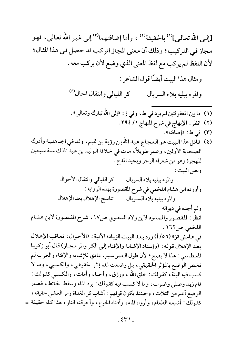 في هامش "ز" (٥٦/ أ) ورد بعد البيت الزيادة الآتية: "الأحوال: تعاقب الإهلال بعد الإهلال قوله: (وإسناد الإشابة والإفناء إلى الكر والمر مجاز) قال أبو زكريا المسطاسي: هذا لا يصح؛ لأن طول العمر سبب عادي للإشابه والإفناء والعرب لم تخص الوضع بالمؤثر الحقيقي، بل وضعت للمؤثر الحقيقي، والكسبي، وما لا كسب فيه البتة، كقولك: خلق الله، ورزق، وأحيا، وأمات، والكسبي كقولك: قام زيد وصلى وضرب، وما لا كسب فيه كقولك: برد الماء وسقط الحائط، فصار الوضع أعم من الثلاث، وحينئذ يكون قولهم: أشاب كر الغداة ومر العشي حقيقة، كقولك: أشبعه الطعام، وأرواه الماء، وأفناه الجوع، وأحرقته النار، هذا كله حقيقة =