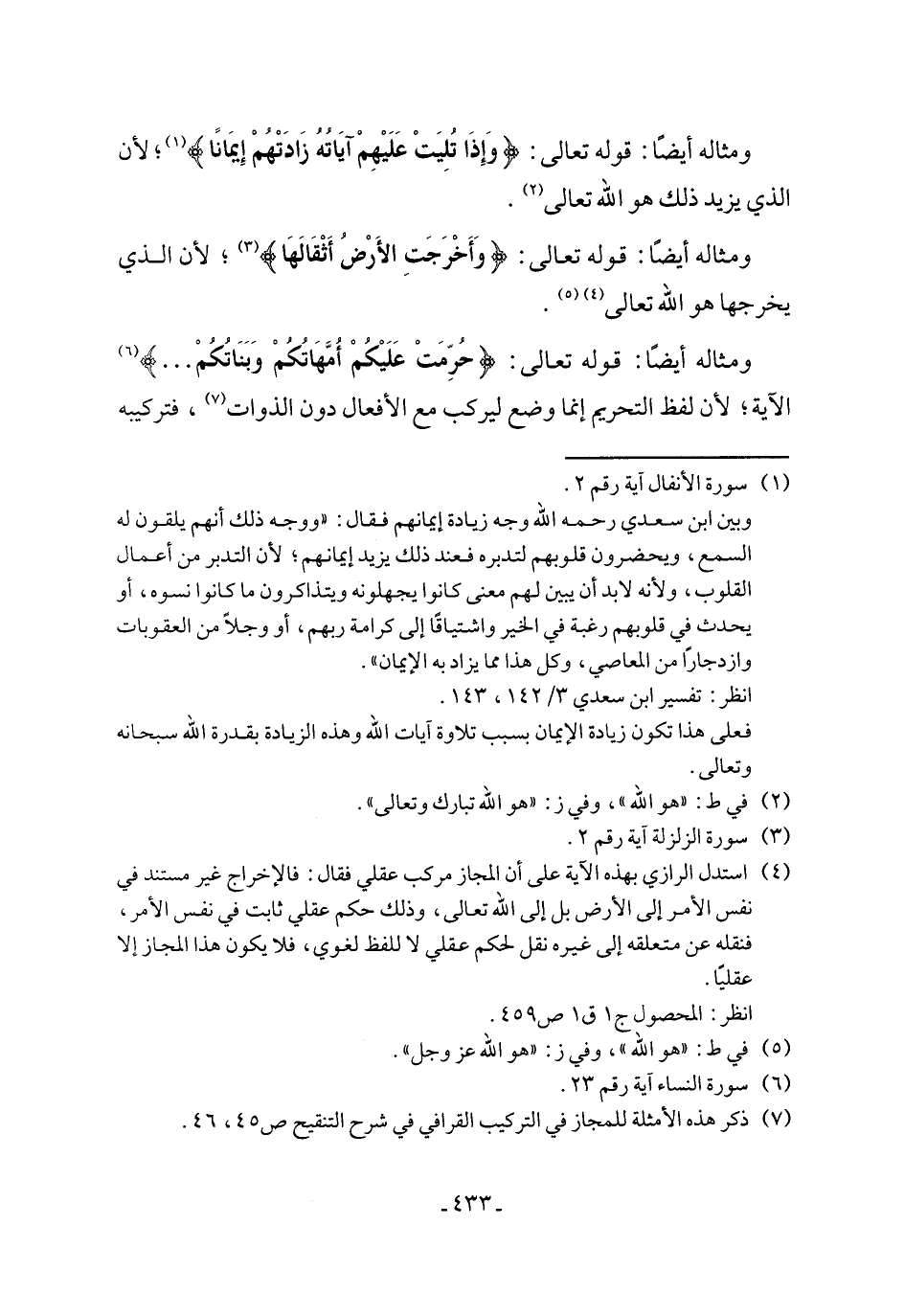 ومثاله أيضًا: قوله تعالى: {حُرِّمَتْ عَلَيْكُمْ أُمِّهَاتُكمْ وَبَنَاتُكُمْ ...} (٦) الآية؛ لأن لفظ التحريم إنما وضع ليركب مع الأفعال دون الذوات (٧)، فتركيبه