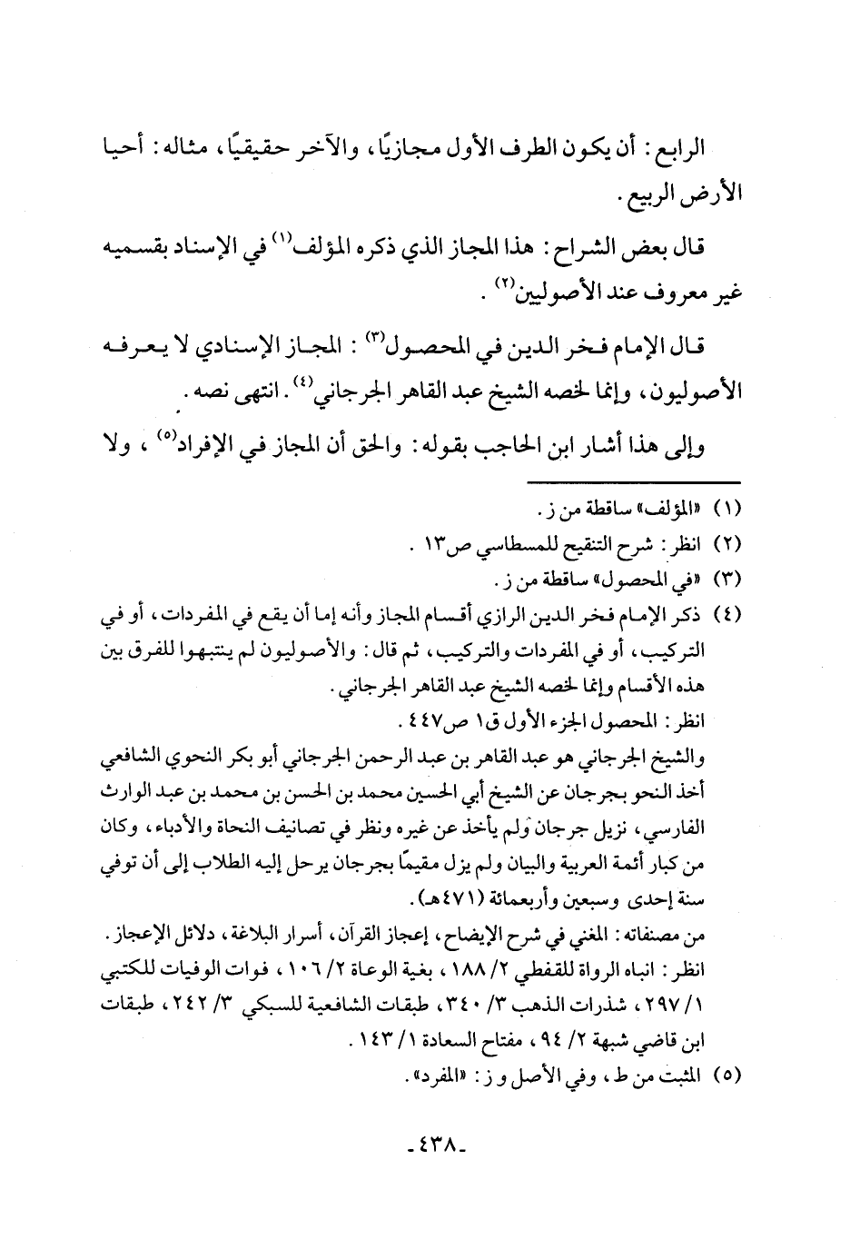 (٤) ذكر الإمام فخر الدين الرازي أقسام المجاز وأنه إما أن يقع في المفردات، أو في التركيب، أو في المفردات والتركيب، ثم قال: والأصوليون لم ينتبهوا للفرق بين هذه الأقسام وإنما لخصه الشيخ عبد القاهر الجرجاني.