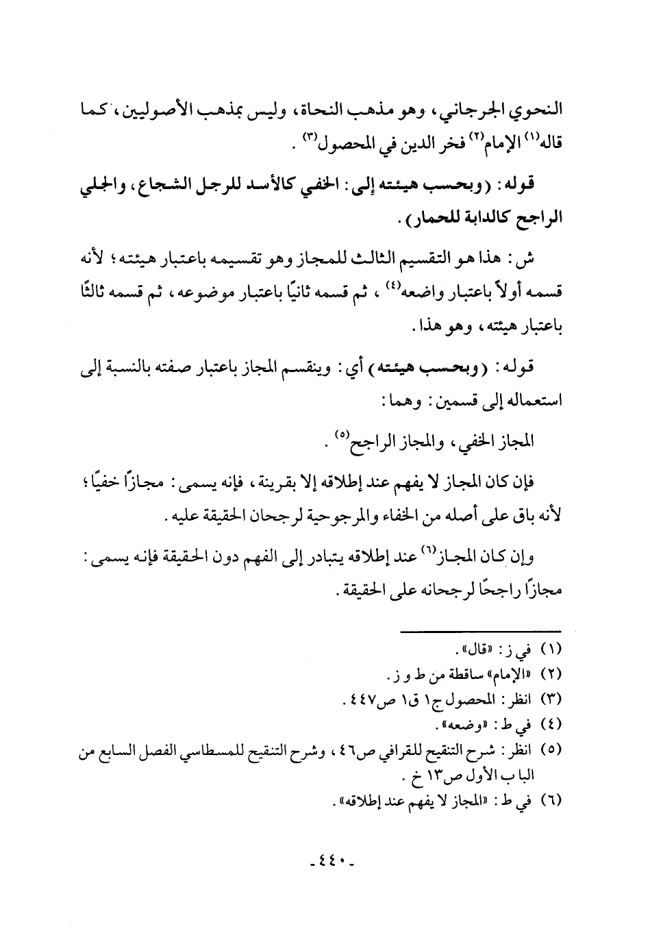 النحوي الجرجاني، وهو مذهب النحاة، وليس بمذهب الأصوليين، كما قاله (١) الإمام (٢) فخر الدين في المحصول (٣).
