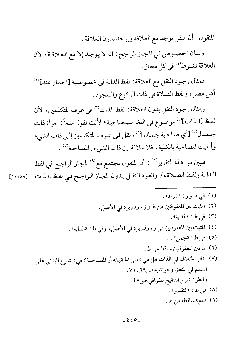 (٧) انظر الخلاف في الذات هل هي بمعنى الحقيقة أو المصاحبة؟ في: شرح البناني على السلم في المنطق وحواشيه ص ٦٩ - ٧١.
