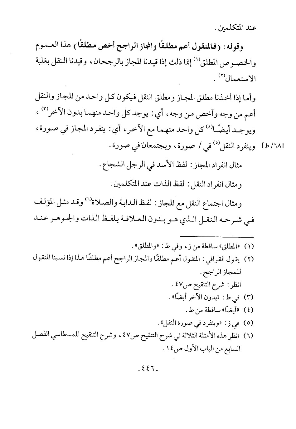 ومثال اجتماع النقل مع المجاز: لفظ الدابة والصلاة (٦) وقد مثل المؤلف في شرحه النقل الذي هو بدون العلاقة بلفظ الذات والجوهر عند