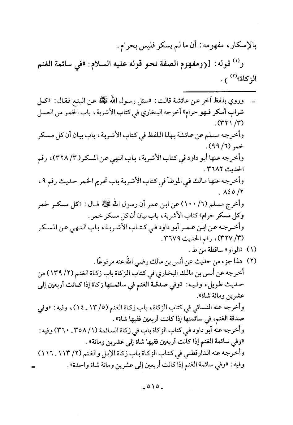 و (١) قوله: [(ومفهوم الصفة نحو قوله عليه السلام: "في سائمة الغنم الزكاة" (٢)).