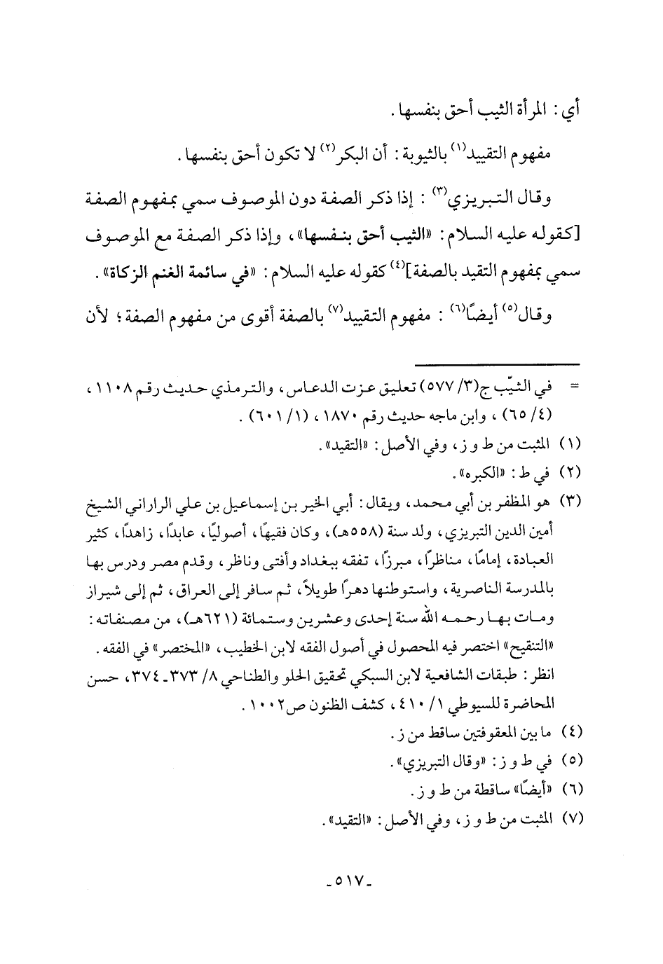 وقال التبريزي (٣): إذا ذكر الصفة دون الموصوف سمي بمفهوم الصفة [كقوله عليه السلام: "الثيب أحق بنفسها"، وإذا ذكر الصفة مع الموصوف سمي بمفهوم التقيد بالصفة] (٤) كقوله عليه السلام: "في سائمة الغنم الزكاة".