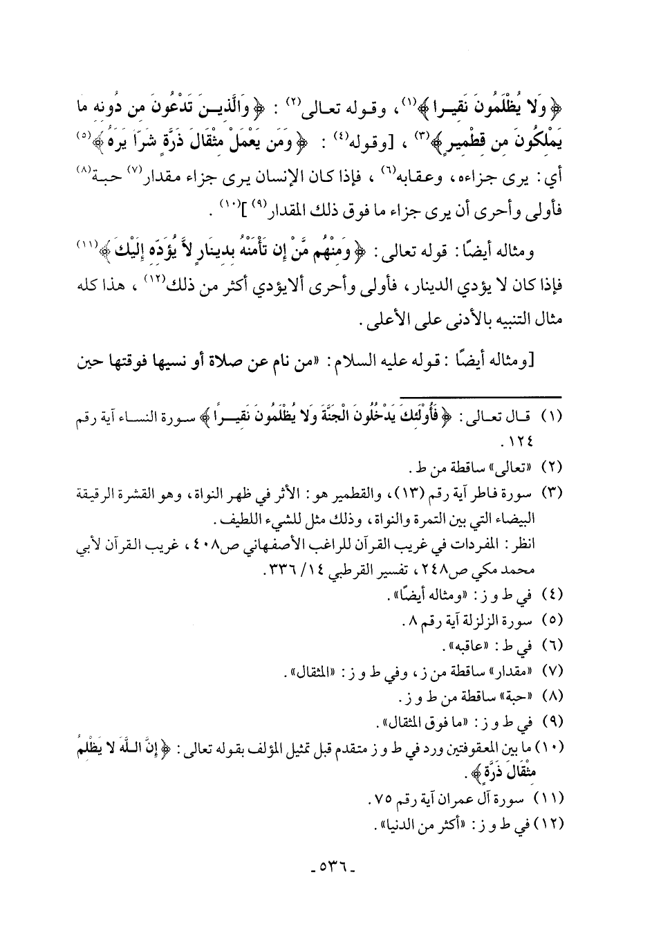 (١٠) ما بين المعقوفتين ورد في ط وز متقدم قبل تمثيل المؤلف بقوله تعالى: {إِنَّ اللَّهَ لَا يَظْلِمُ مِثْقَالَ ذَرَّةٍ}.