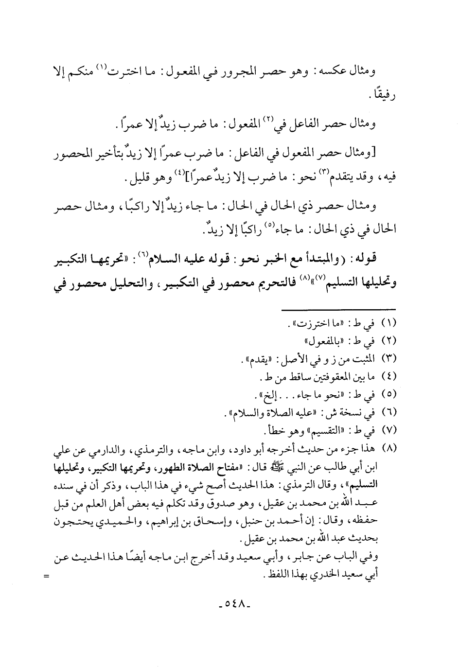 (٨) هذا جزء من حديث أخرجه أبو داود، وابن ماجه، والترمذي، والدارمي عن علي ابن أبي طالب عن النبي - صلى الله عليه وسلم - قال: "مفتاح الصلاة الطهور، وتحريمها التكبير، وتحليلها التسليم"، وقال الترمذي: هذا الحديث أصح شيء في هذا الباب، وذكر أن في سنده عبد الله بن محمد بن عقيل، وهو صدوق وقد تكلم فيه بعض أهل العلم من قبل حفظه، وقال: إن أحمد بن حنبل، وإسحاق بن إبراهيم، والحميدي يحتجون بحديث عبد الله بن محمد بن عقيل.