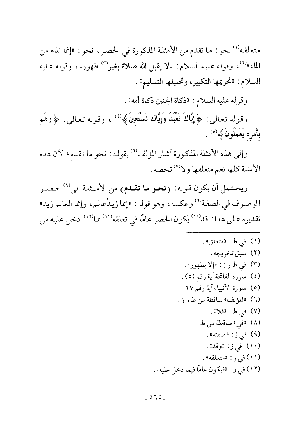 متعلقه (١) نحو: ما تقدم الأمثلة المذكورة في الحصر، نحو: "إنما الماء من الماء" (٢)، وقوله عليه السلام: "لا يقبل الله صلاة بغير (٣) طهور"، وقوله عليه السلام: "تحريمها التكبير، وتحليلها التسليم".