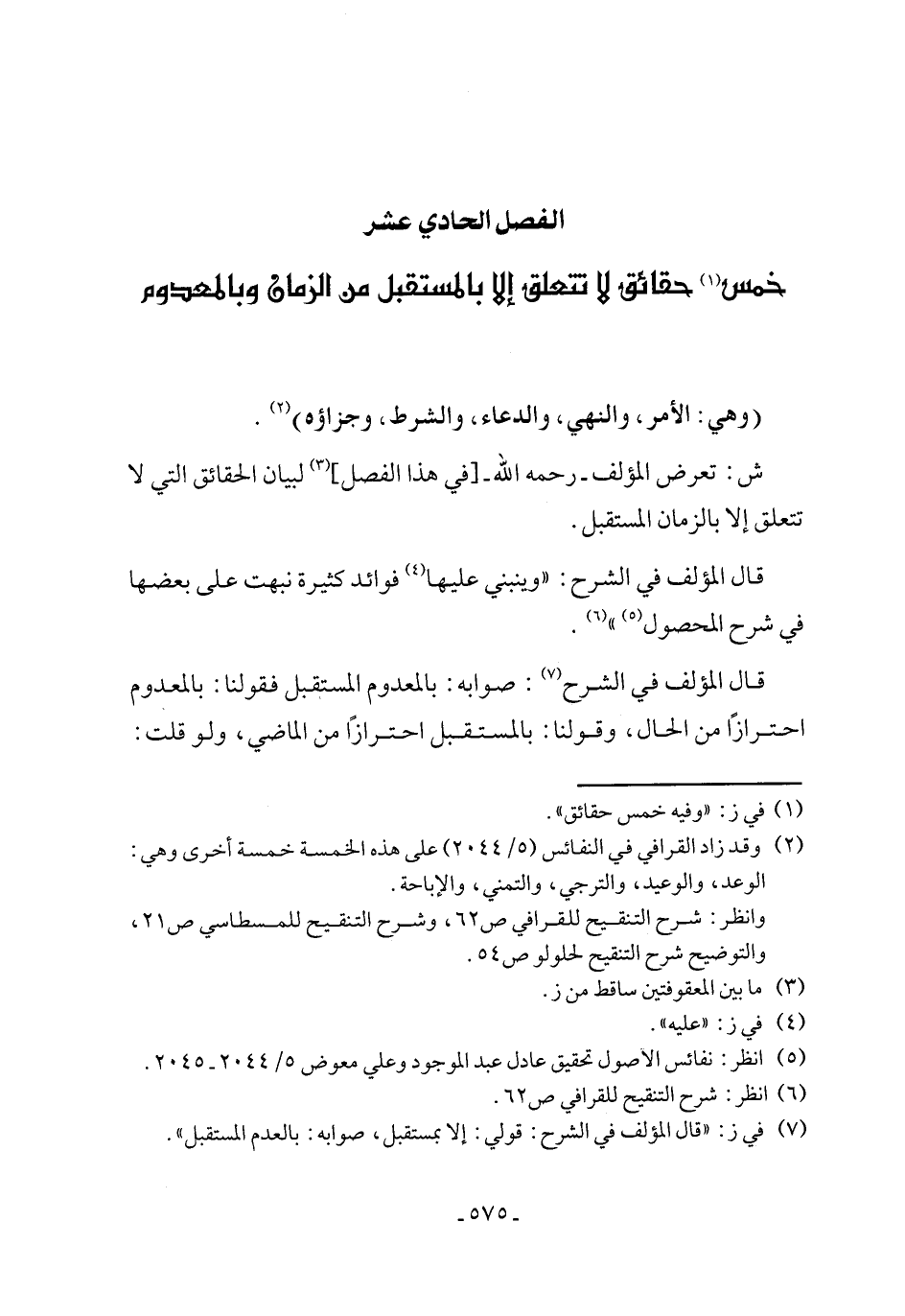 الفصل الحادي عشر: خمس (١) حقائق لا تتعلق إلا بالمستقبل من الزمان وبالمعدوم