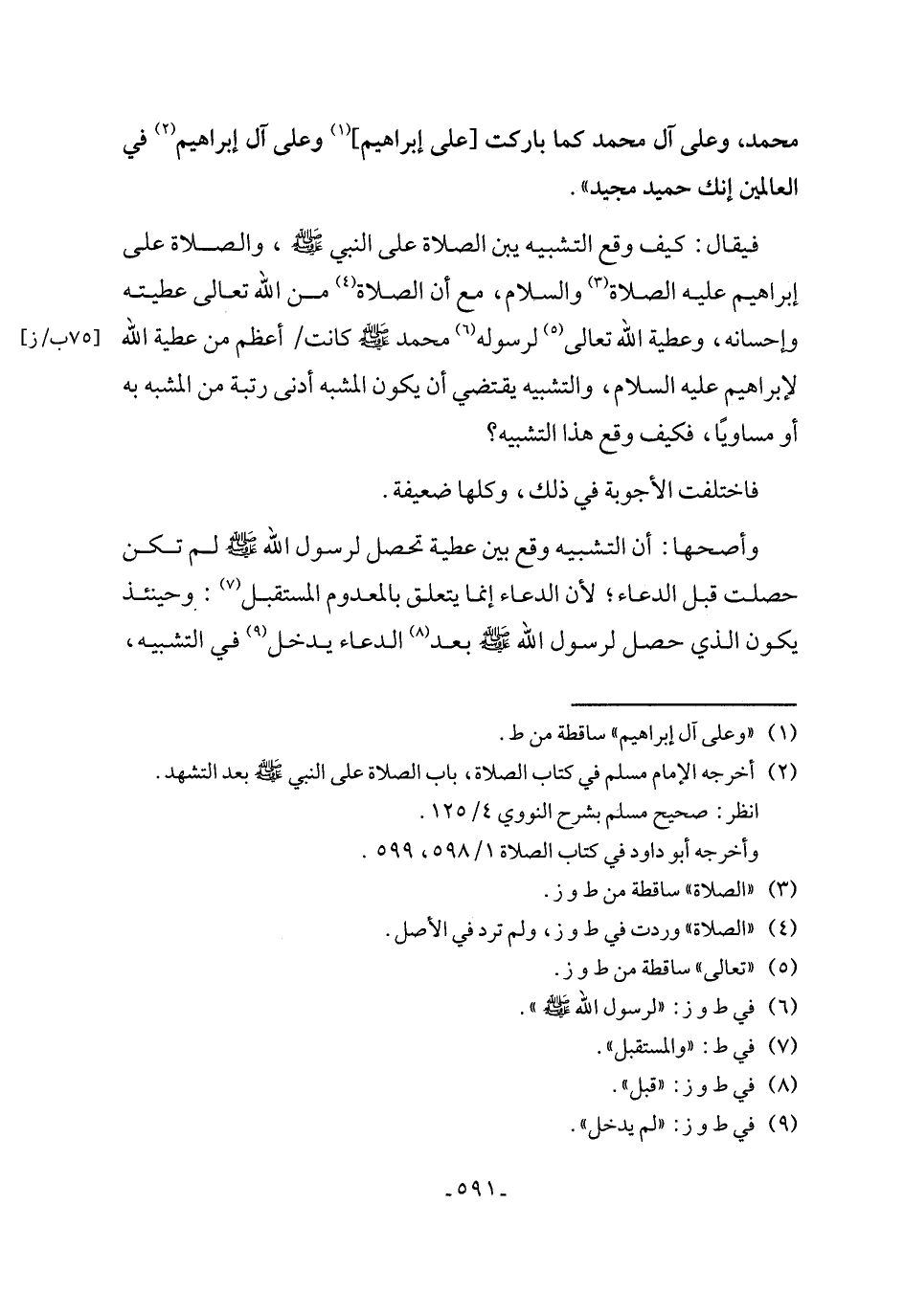 (٢) أخرجه الإمام مسلم في كتاب الصلاة، باب الصلاة على النبي - صلى الله عليه وسلم - بعد التشهد.