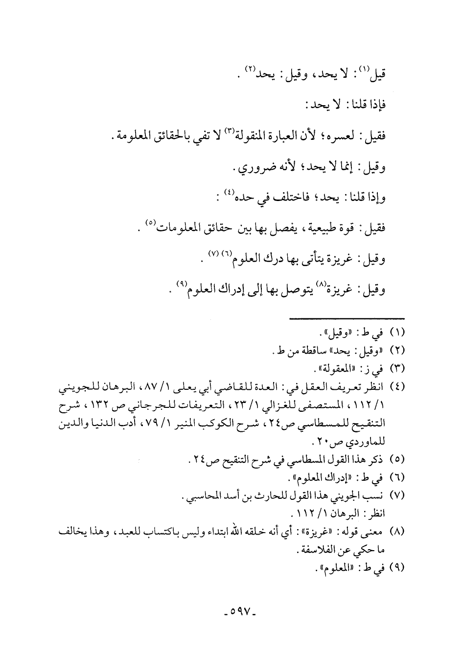 وقيل: غريزة يتأتى بها درك العلوم (٦) (٧).