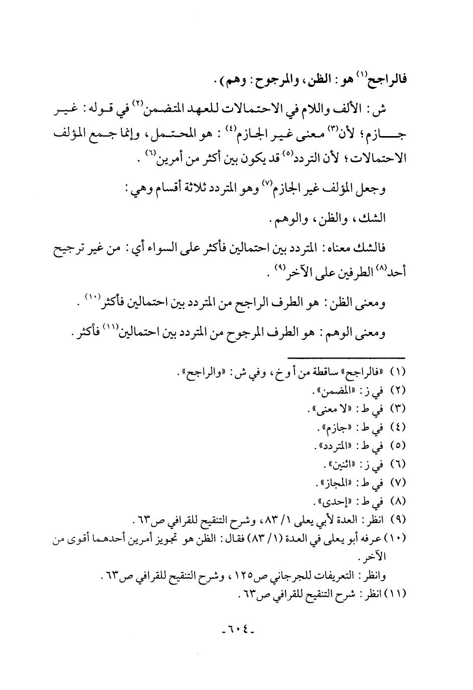 ش: الألف واللام في الاحتمالات للعهد المتضمن (٢) في قوله: غير جازم؛ لأن (٣) معنى غير الجازم (٤): هو المحتمل، وإنما جمع المؤلف الاحتمالات؛ لأن التردد (٥) قد يكون بين أكثر من أمرين (٦).