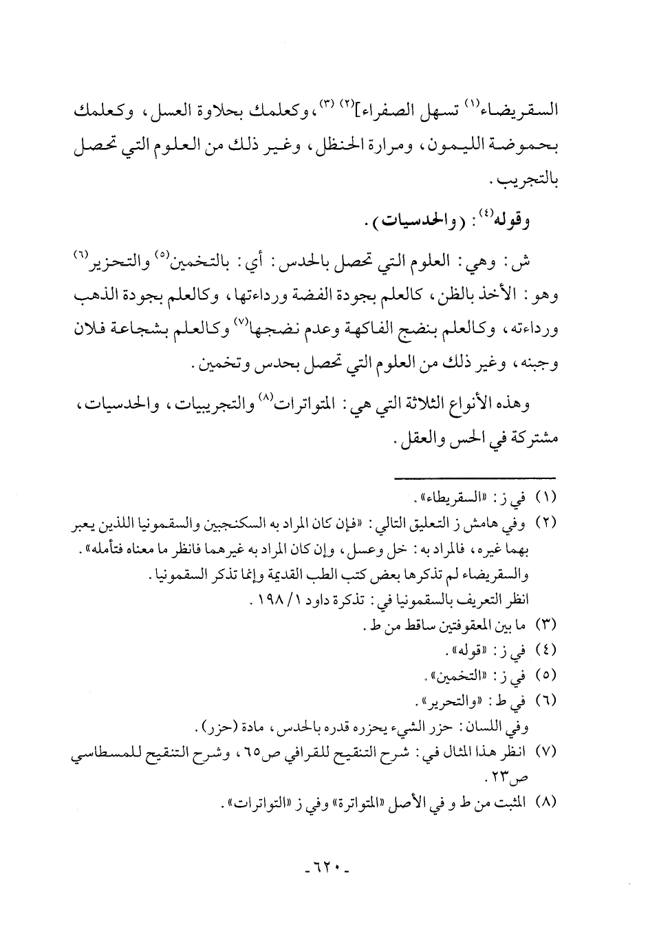 وهذه الأنواع الثلاثة التي هي: المتواترات (٨) والتجريبيات، والحدسيات، مشتركة في الحس والعقل.