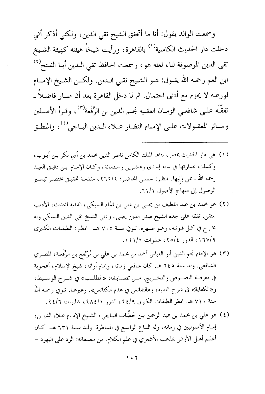 وسمعت الوالد يقول: أنا ما أتحقق الشيخ تقي الدين، ولكني أذكر أني دخلت دار الحديث الكاملية (¬١) بالقاهرة، ورأيت شيخًا هيئته كهيئة الشيخ تقي الدين الموصوفة لنا، لعله هو، وسمعت الحافظ تقي الدين أبا الفتح (¬٢) ابن العم رحمه الله يقول: هو الشيخ تقي الدين. ولكن الشيخ الإمام لورعه لا يجزم مع أدنى احتمال. ثم لما دخل القاهرة بعد أن صار فاضلًا - تفقَّه على شافعي الزمان الفقيه نجم الدين بن الرِّفْعة (¬٣)، وقرأ الأصلين وسائر المعقولات على الإمام النظار علاء الدين الباجي (¬٤)، والمنطق