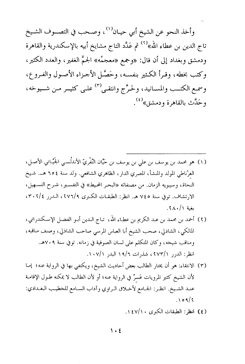 (¬٢) أحمد بن محمد بن عبد الكريم بن عطاء الله، تاج الدين أبو الفضل الإسكندراني، المالكي، الشاذلي، صحب الشيخ أبا العباس المرسي صاحب الشاذلي، وصنف مناقبه، ومناقب شيخه، وكان المتكلم على لسان الصوفية في زمانه. توفي سنة ٧٠٩ هـ. انظر: الدرر ١/ ٢٧٣، شذرات ٦/ ١٩ البدر ١/ ١٠٧.