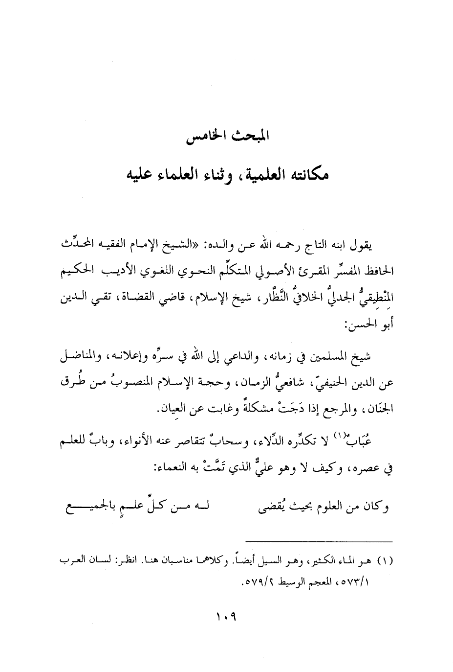 عُبَابٌ (¬١) لا تكدِّره الدِّلاء، وسحابٌ تتقاصر عنه الأنواء، وبابٌ للعلم في عصره، وكيف لا وهو عليٌّ الذي تَمَّتْ به النعماء: