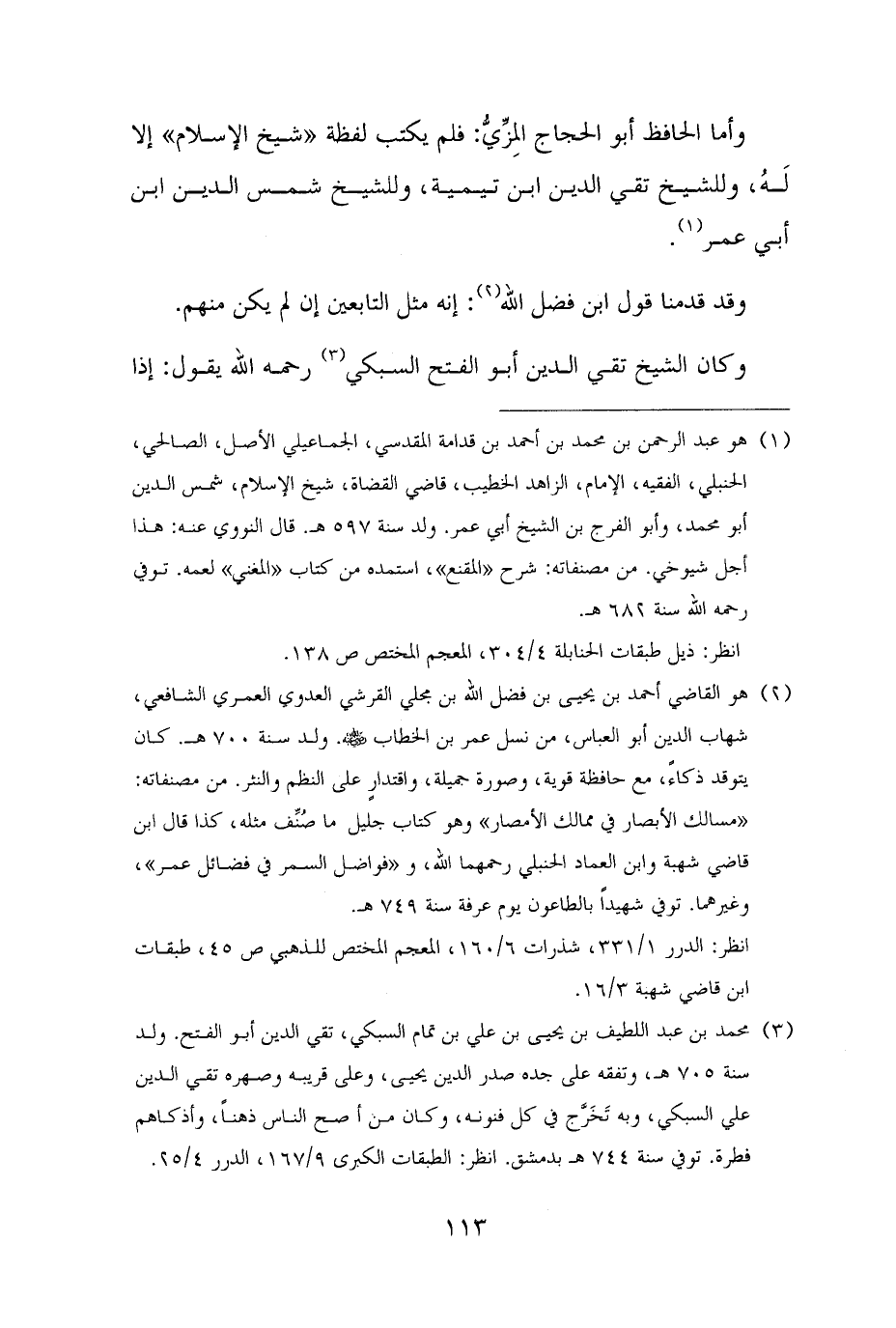 وأما الحافظ أبو الحجاج المِزِّيُّ: فلم يكتب لفظة "شيخ الإسلام" إلا لَهُ، وللشيخ تقي الدين ابن تيمية، وللشيخ شمس الدين ابن أبي عمر (¬١).