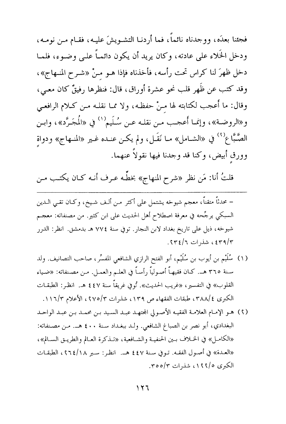 فجئنا بعدَه، ووجدناه نائمًا، فما أردنا التشويشَ عليه، فقام من نومه، ودخل الخَلاء على عادته، وكان يريد أن يكون دائمًا على وضوء، فلما دخل ظهرَ لنا كراس تحت رأسه، فأخذناه فإذا هو مِنْ "شرح المنهاج"، وقد كتب عن ظَهر قلب نحو عشرة أوراق، قال: فنظرها رفيقٌ كان معي، وقال: ما أَعجب لكتابته لها مِنْ حفظه، ولا مما نقله من كلام الرافعي و"الروضة"، وإنما أَعجب من نقله عن سُلَيم (¬١) في "المُجَرَّد"، وابن الصَّبَّاع (¬٢) في "الشامل" ما نَقَل، ولم يكن عنده غير "المنهاج" ودواةٍ وورقٍ أبيض، وكنا قد وجدنا فيها نقولًا عنهما.