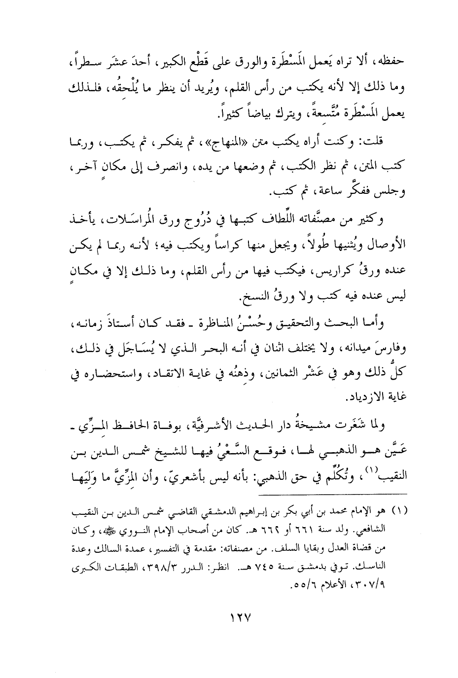 قلت: وكنت أراه يكتب متن "المنهاج"، ثم يفكر، ثم يكتب، وربما كتب المتن، ثم نظر الكتب، ثم وضعها من يده، وانصرف إلى مكانٍ آخر، وجلس ففكَّر ساعة، ثم كتب.