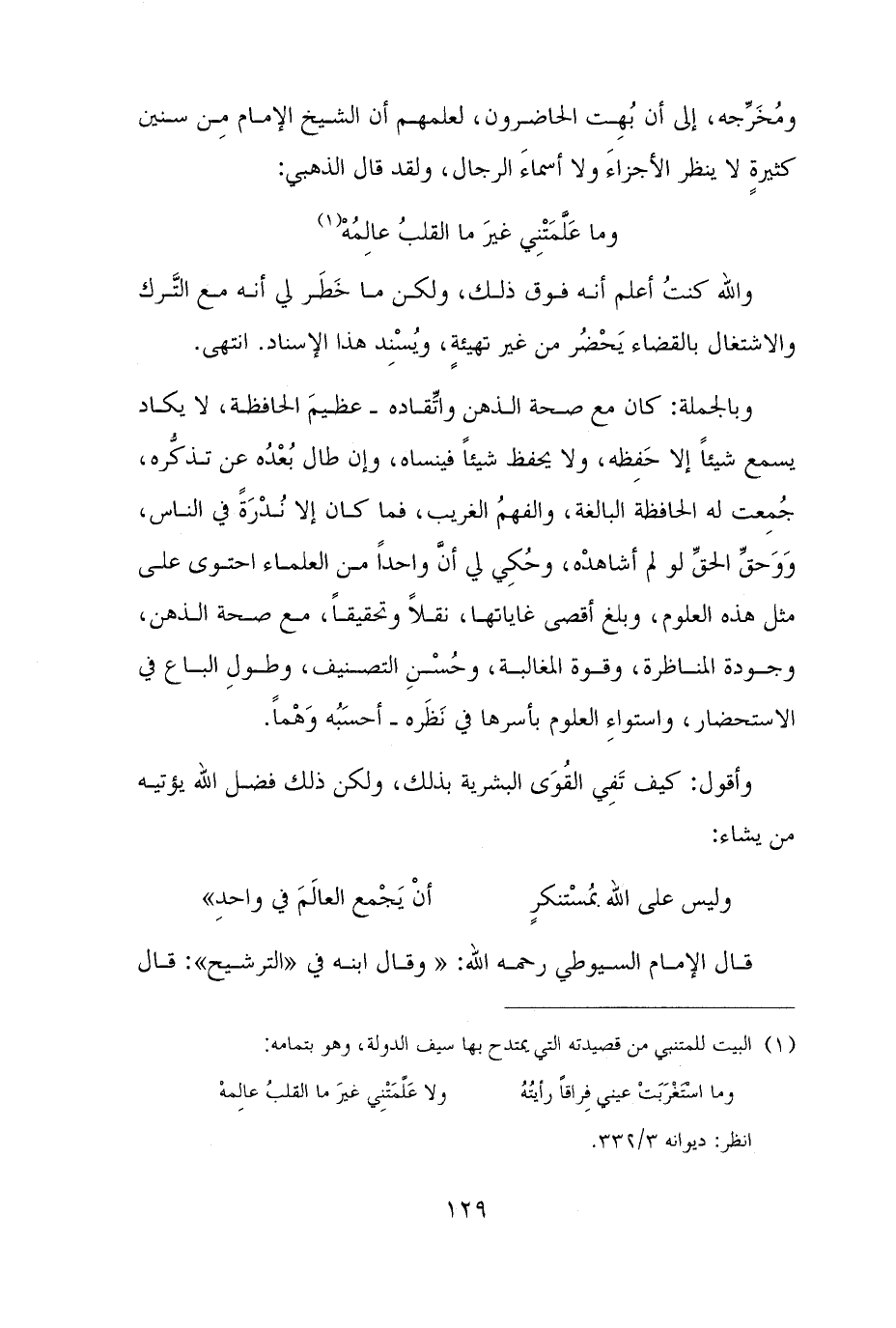وبالجملة: كان مع صحة الذهن واتِّقاده - عظيمَ الحافظة، لا يكاد يسمع شيئًا إلا حَفِظه، ولا يحفظ شيئًا فينساه، وإن طال بُعْدُه عن تذكُّره، جُمِعت له الحافظة البالغة، والفهمُ الغريب، فما كان إلا نُدْرَةً في الناس، وَوَحقِّ الحقِّ لو لم أشاهدْه، وحُكِي لي أنَّ واحدًا من العلماء احتوى على مثل هذه العلوم، وبلغ أقصى غاياتها، نقلًا وتحقيقًا، مع صحة الذهن، وجودة المناظرة، وقوة المغالبة، وحُسْنِ التصنيف، وطولِ الباع في الاستحضار، واستواءِ العلوم بأسرها في نَظَره - أحسَبُه وَهْمًا.