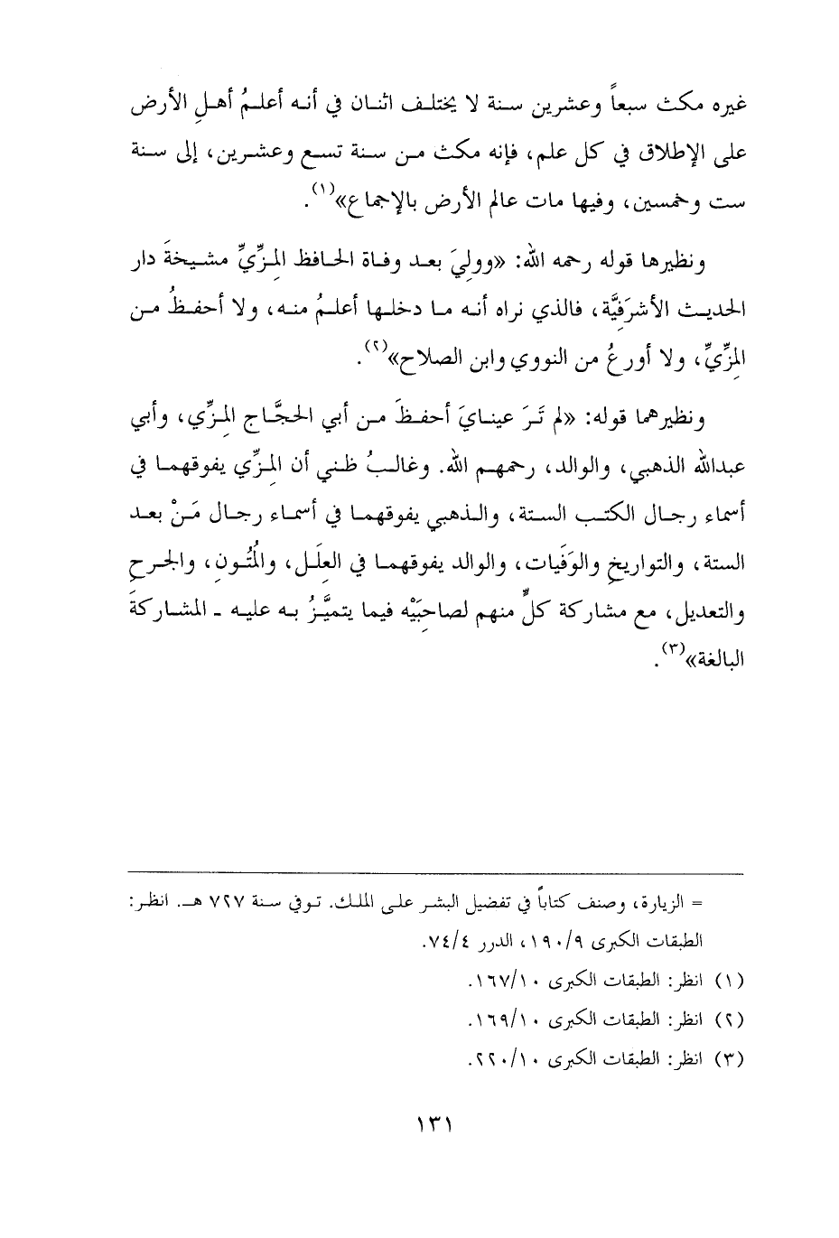 ونظيرهما قوله: "لم تَرَ عينايَ أحفظَ من أبي الحجَّاج المِزِّي، وأبي عبد الله الذهبي، والوالد، رحمهم الله. وغالبُ ظني أن المِزِّي يفوقهما في أسماء رجال الكتب الستة، والذهبي يفوقهما في أسماء رجال مَنْ بعد الستة، والتواريخِ والوَفَيات، والوالد يفوقهما في العِلَل، والمُتُونِ، والجرحِ والتعديل، مع مشاركة كلٍّ منهم لصاحِبَيْه فيما يتميَّزُ به عليه - المشاركةَ البالغة" (¬٣).